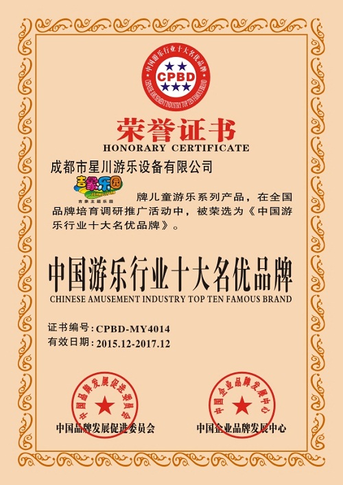 成都市星川游乐设备有限公司经过前期的发展,以及对品牌声誉和影响力的不断塑造,近日该公司“吉象乐园”室内儿童乐园品牌在全国品牌调研推广活动中,荣获中国品牌发展促进委员会、中国企业品牌发展中心颁发的“中国最具特色加盟品牌、中国游乐行业十大名优品牌、中国游乐行业十佳诚信企业、中国游乐行业十大影响力人物”荣誉称号。