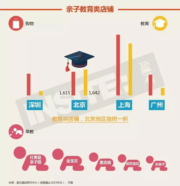 在五大城市中,北京是唯一一个亲子教育类店铺数量超过亲子购物类的城市。由此可见,北京地区的家长对于教育的重视程度要远高于其它城市。北京地区优秀的教育资源较为集中,亲子教育类店铺数量也因超过亲子购物类而在五大城市范围内“独树一帜”。其中从盈石集团研究中心定期追踪的五大儿童早教品牌来看,截至2015年第四季度,红黄蓝亲子园已在全国范围内拥有782家亲子园。红黄蓝推崇“亲子园+幼儿园”的一体化发展模式,不仅可以实现资源整合及共享,还可以维系稳定的师资力量,从而在市场上打造差异化竞争力。
