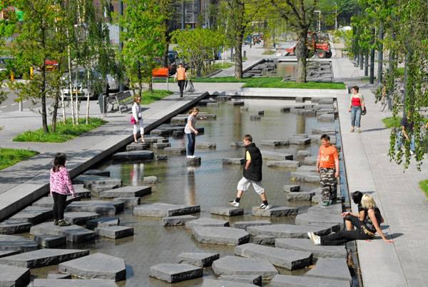 该街道附近是一条高质量的步行道,孩子、成年人和老年人可在这欣赏水景。这条小溪沿线有许多密集的长凳,朝向街道和步行空间,还种植树木提供阴凉。孩子们喜欢跳到踏脚石上玩耍,因为水箱并不深,父母不用担心孩子们跑来跑去的。这个项目适合所有年龄段的人。