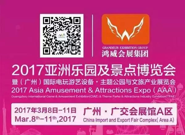 站在游乐行业发展的前沿,广东鸿威国际会展集团有限公司联合多家单位,倾力打造了“中国(广州)国际电玩暨游艺设备展览会(简称CIAE)”、“中国(广州)国际主题公园与文旅产业展览会(简称TPAE)”两大盛会,为全球游乐行业人士提供一个高端便捷的商贸平台。2017年,为加深游乐行业的交融和互动,CIAE & TPAE将升级为“亚洲乐园及景点博览会(简称)AAA”,并于3月8-11日在广州中国进出口商品交易会A区隆重举行。